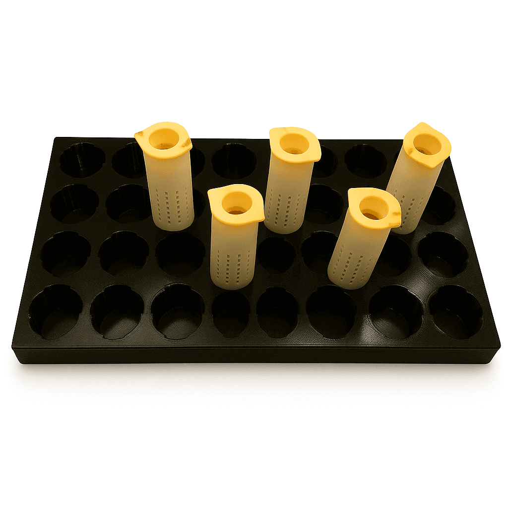 Elke tray is in eigen ontwikkeling, met precisie vervaardigd en tot op de millimeter passend. Hierdoor klemmen de originele kooitjes stevig en veilig in de tray — ideaal voor zowel professionele teeltbedrijven als fanatieke hobby-telers.